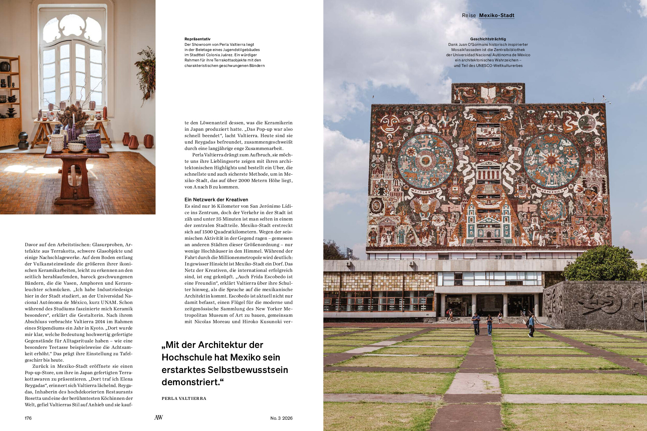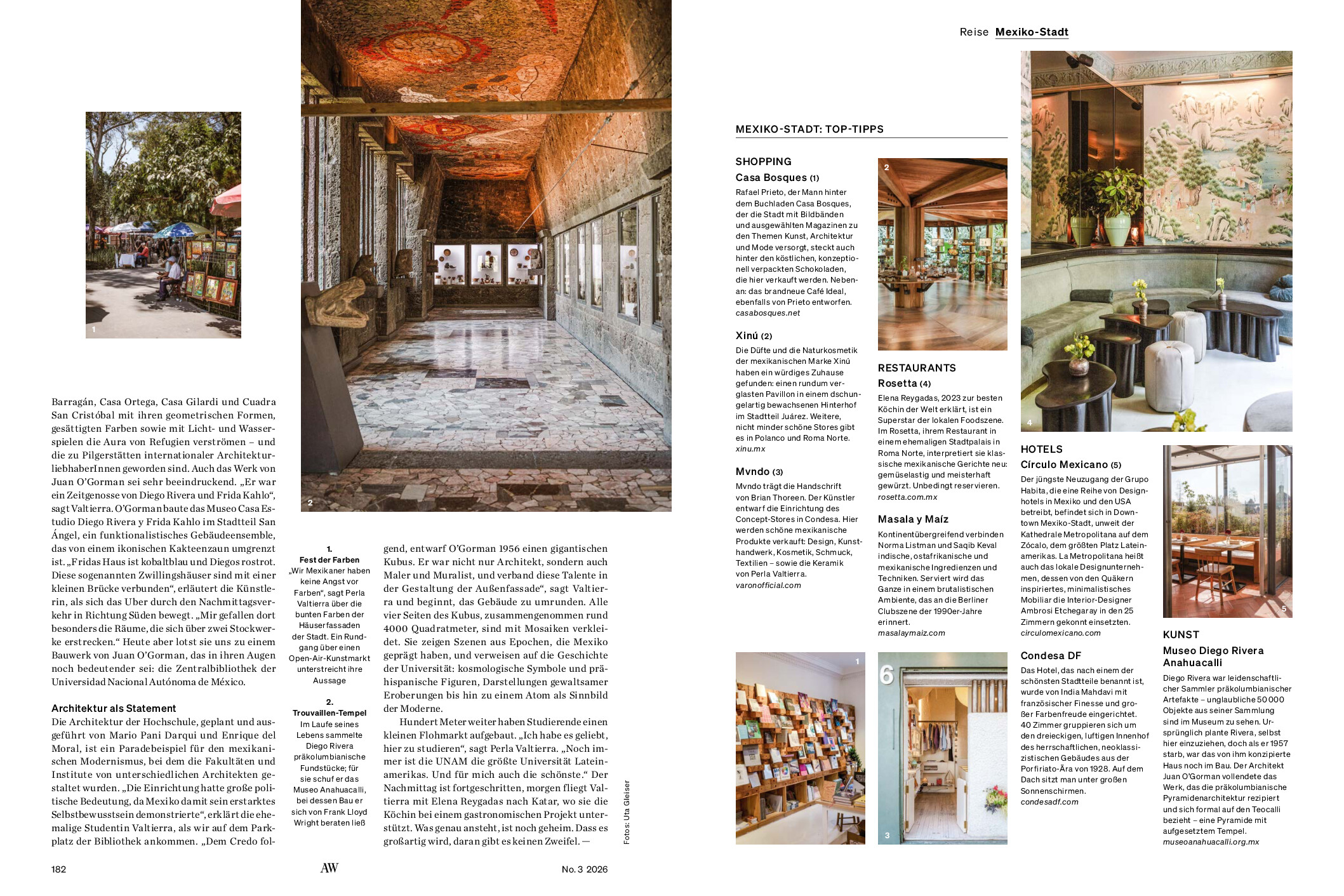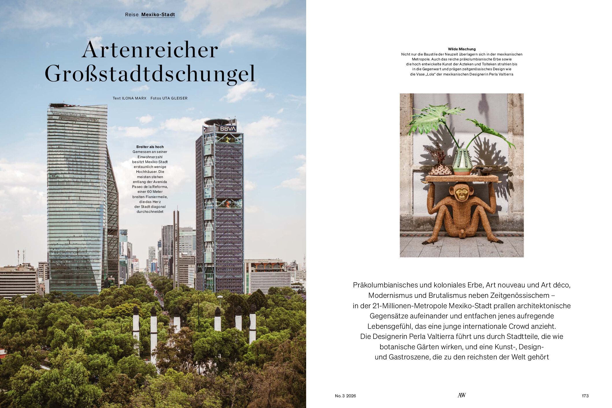 Präkolumbianisches und koloniales Erbe, Art nouveau und Art déco, Modernismus und Brutalismus neben Zeitgenössischem – in der 21-Millionen-Metropole Mexiko-Stadt prallen architektonische Gegensätze aufeinander und entfachen jenes aufregende Lebensgefühl, das eine junge internationale Crowd anzieht. Die Designerin Perla Valtierra führt uns durch Stadtteile, die wie botanische Gärten wirken, und eine Kunst-, Design- und Gastroszene, die zu den reichsten der Welt gehört.