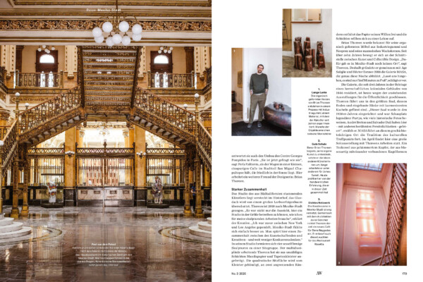Die Galerie, die seit drei Jahren in der Beletage eines herrschaftlichen kolonialen Gebäudes von 1846 residiert, ist heute wegen der anstehenden Ausstellungen für die Öffentlichkeit geschlossen. Thoreen führt uns in den größten Saal, dessen Boden und eingebaute Bänke mit karmesinroten Kacheln gefliest sind. „Dieser Saal wurde in den 1930er-Jahren eingerichtet und war Schauplatz legendärer Partys, wie viele historische Fotos beweisen. André Breton und Salvador Dalí haben hier – mit anderen berühmten Persönlichkeiten – gefeiert“, erzählt er. MASA führt an diesem geschichtsträchtigen Ort die Tradition des kulturellen Treffpunkts fort. Im April findet hier eine große Soloausstellung mit Thoreens Arbeiten statt. Ein Teekessel aus gehämmertem Kupfer, der aus blasenartig miteinander verbundenen Kugelformen besteht, hat bereits einen Platz auf der gefliesten Anrichte gefunden. Doch vor der Eröffnung wartet noch viel Arbeit auf den Künstler. Er rät: „Geht auch bei Kurimanzutto vorbei“, bevor er sich auf den Weg zurück zu seinem Studio macht.