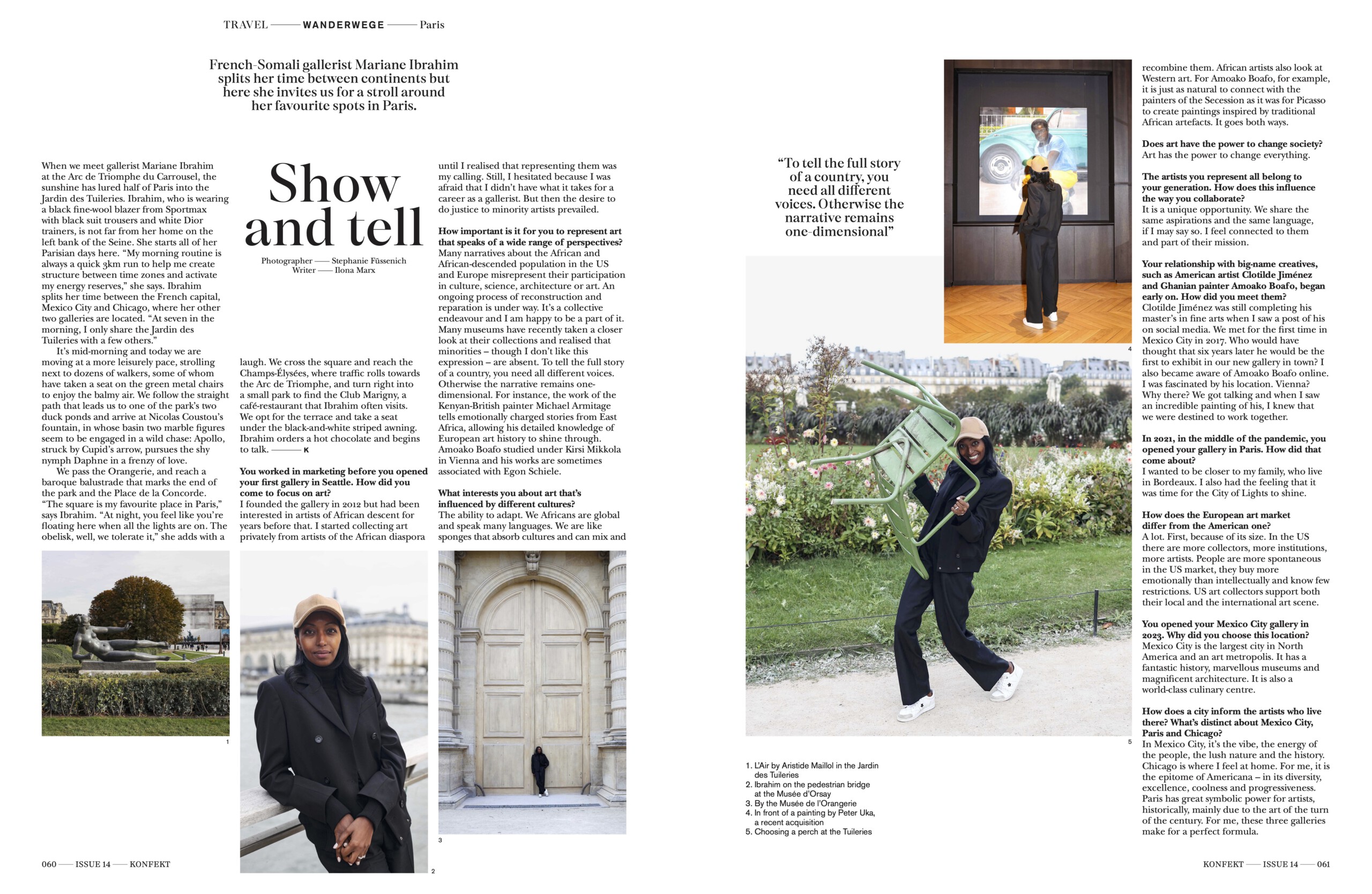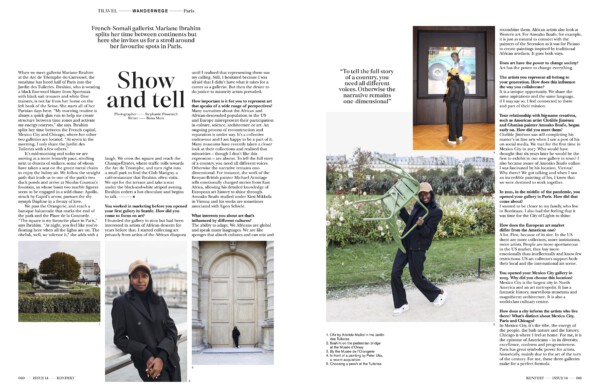 Mariane Ibrahim ist Weltbürgerin. In Neukaledonien als Tochter somalischer Eltern geboren, wuchs sie in Frankreich auf, studierte in Großbritannien und Kanada. Heute unterhält sie Galerien in Chicago, Paris und Mexico City. Ihr Schwerpunkt: die Arbeiten afrikanischer und afrikanischstämmige Künstler. Auf einem Spaziergang durch Paris erklärt sie, warum Kunst ihr Leben ist.
