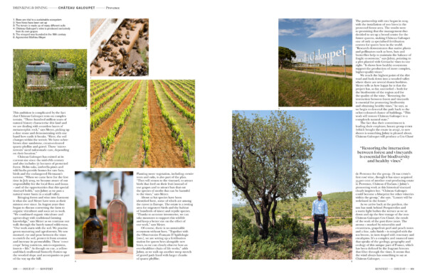 Die Partnerschaft mit der OFA begann 2019 mit der Aufstellung von 200 Bienenstöcken in dem geschützten Waldgebiet. Die Ergebnisse waren so vielversprechend, dass das Führungsduo beschloss, ein Brutzentrum für die künftigen Königinnen einzurichten. So entstand in Château Galoupet eine von nur zwölf Befruchtungsstationen für Bienenköniginnen der Welt. Diese Brutstätte ist für Königinnen bestimmt, die vor Ort geschlüpft sind. „Forschungen belegen, dass heimische Pflanzen und Bestäuber wie Bienen, Fledermäuse und Schmetterlinge zur Bewahrung des Gleichgewichts von fragilen Ökosystemen beitragen, und zeigen auf, wie gesunde Ökosysteme die Erzeugung komplexerer, hochwertigerer Weine unterstützen“, erklärt die Geschäftsführerin.