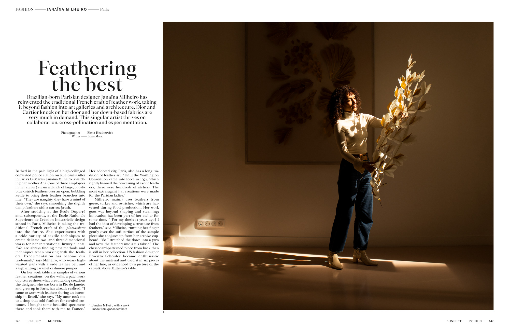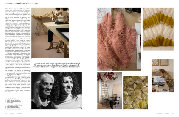 „Wir finden bei der Arbeit mit den Federn immer neue Methoden und Techniken, das Experimentieren ist unser Markenzeichen geworden.“ Janaïna Milheiro trägt eine hochgeschnittene Jeans mit breitem Ledergürtel und  einen eng anliegenden caramelfarbenen Kaschmirpullover. Auf ihrem Arbeitstisch liegen Muster verschiedener Federarbeiten, an den Wänden zeigt ein Patchwork von Bildern, welch atemberaubende Kreationen die gebürtige Brasilianerin, die in Rio geboren und in Paris aufgewachsen ist, bereits verwirklicht hat. „Zur Arbeit mit den Federn bin ich während eines Praktikums in Brasilien gekommen. Mein Tutor nahm mich in ein Geschäft mit, in dem Federn für Karnevalskostüme verkauft wurden. Ich erwarb dort einige schöne Exemplare und nahm sie mit nach Frankreich“, kehrt Milheiro gedanklich zu ihren Anfängen zurück. Auch ihre Wahlheimat Paris hat eine lange Tradition der Federkunst. „Bis 1976 die Washingtoner Konvention in Kraft trat, die die Verarbeitung exotischer Federn verbot, gab es hunderte Ateliers. Dort wurden die ausgefallensten Hutkreationen für die Pariser Damenwelt angefertigt.“