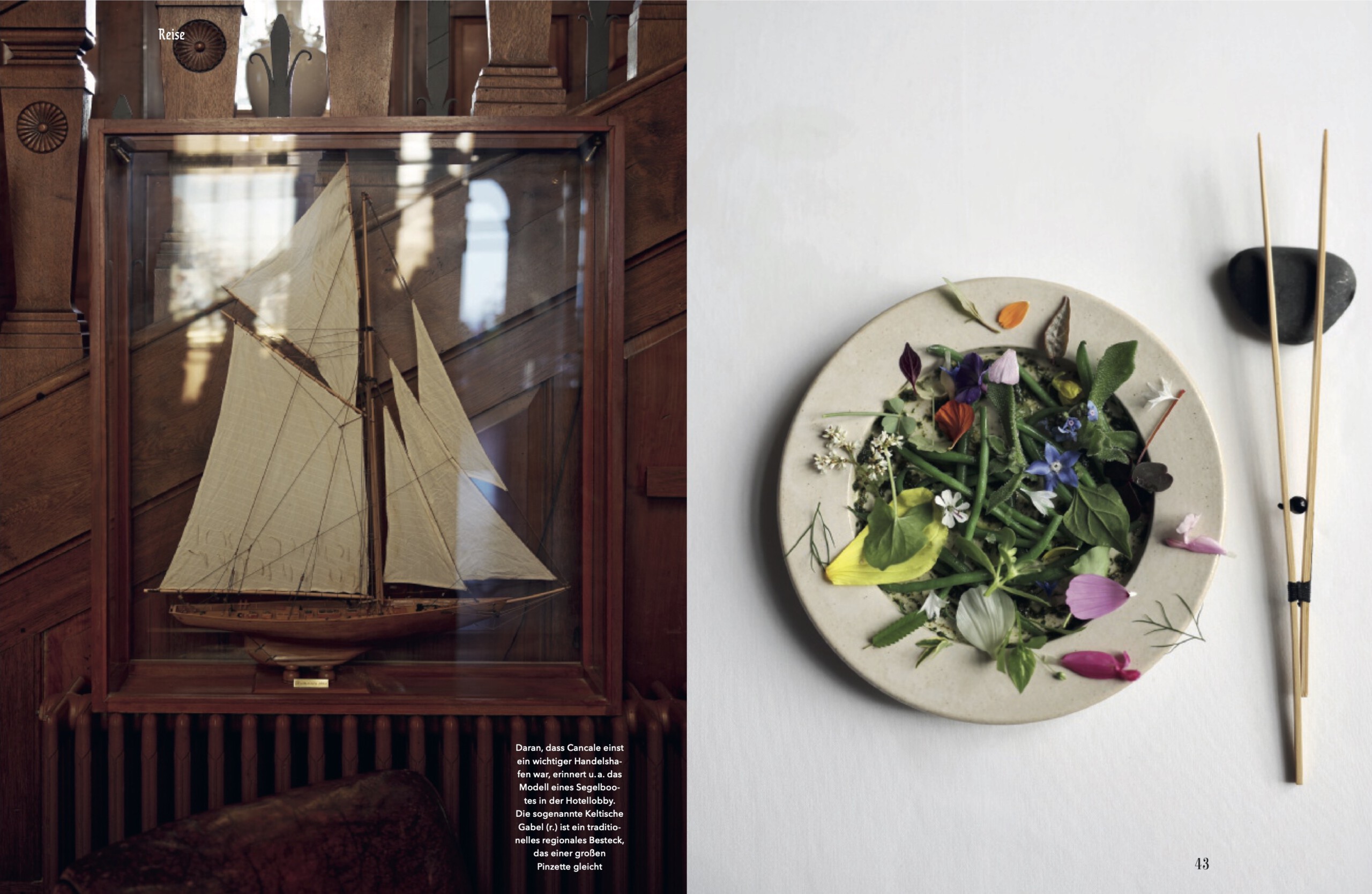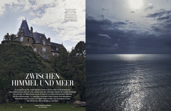 Die D 201 führt von Saint-Malo an der Küste entlang. Zugegeben, es gäbe eine kürzere Strecke nach Cancale, aber diese Route ist einfach die schönere. Gedeckte Beige-, Grün-, Grau- und Blautöne fliegen vorbei. Heuwiesen, Dünen, Watt und Meer. Dazwischen trutzige Steinhäuser, umgeben von üppig blühenden Hortensien, die das feuchte bretonische Klima lieben. Wir sind auf dem Weg zum Château Richeux, ei- nem familiengeführten Relais-&-Châteaux-Hotel, sieben Kilometer südöstlich von Cancale gelegen. Es ist im Besitz der Familie Roellinger, die das 5000 Seelen zählende Küstenstädtchen seit über vier Jahrzehnten gastronomisch prägt.