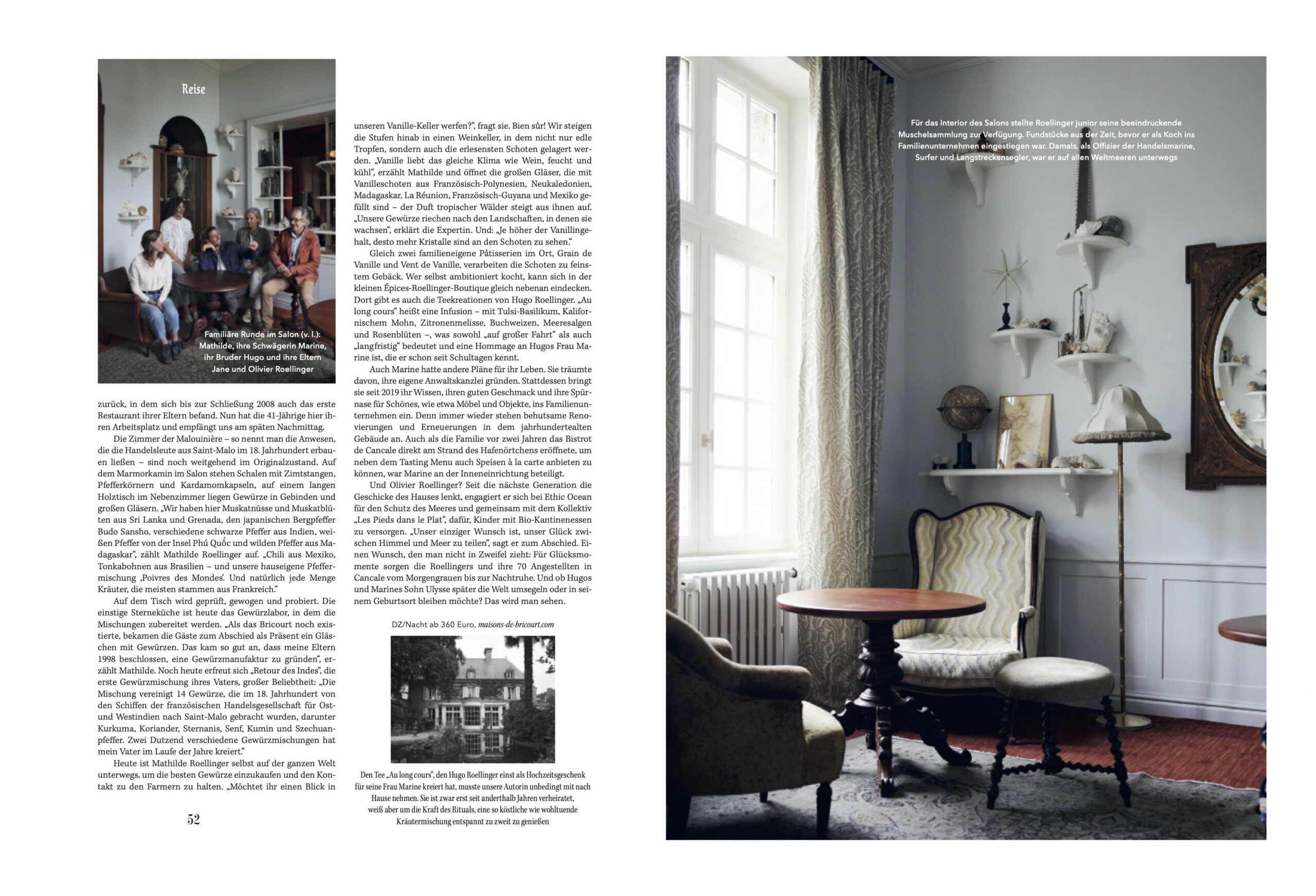 Angefangen hat alles 1982 mit dem Restaurant Les Maisons de Bricourt, das 26 Jahre lang von Olivier Roellinger und seiner Frau Jane geführt wurde und zuletzt mit drei Michelin-Sternen dekoriert war. Um die weit gereisten Gourmets, die bei ihnen speisten, selbst beherbergen zu können, eröffneten die beiden 1988 ihr erstes Hotel: Les Rimains, im ehemaligen Wohnhaus eines Komponisten. Drei Jahre später kauften sie das Château Richeux und bauten es ebenfalls zum Hotel um. Heute ist die nächste Generation ins Geschäft eingestiegen. Die Geschwister Mathilde und Hugo sowie dessen Frau Marine leben die Tradition weiter – auf eigene Art und unter leicht veränderten Vorzeichen.