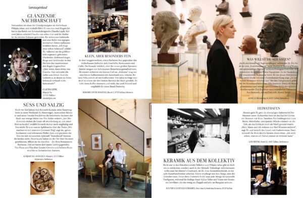 Tallinn ist eine Stadt, in der unzählige Kreative ihrer Arbeit nachgehen. Mit ein Grund dafür sind Förderprogramme des Staates, die DesignerInnen, KünstlerInnen und HandwerkerInnen unterstützen. So gibt es nicht nur in Telliskivi und Põhjala, sondern auch in der Altstadt überdurchschnittlich viele Ateliers und Werkstätten zu entdecken. Eine davon ist besonders gut versteckt und zählt zu Älis Lieblingsadressen. Wenn sie auf der Suche nach einem besonderen Objekt ist, macht sie sich auf den Weg in den Master’s Courtyard, einen Hinterhof vis-à-vis dem Hotel Telegraaf. Dort betreibt eine Gruppe von acht KeramikerInnen, die zum größten Teil in der Keramikklasse der hiesigen Akademie der Künste ausgebildet wurden, ein gemeinsames Atelier mit Verkaufsraum. Heute empfängt uns Ann Nurga, eine der GründerInnen des Ateliers, und zeigt uns die gesammelten Werke ihres Kollektivs. Ihre eigenen Entwürfe sind von Japan inspiriert, während ihr Kollege Kauri Kallas auf seinen Tellern und Tassen fantastische Figuren und Fabelwesen zum Leben erweckt.